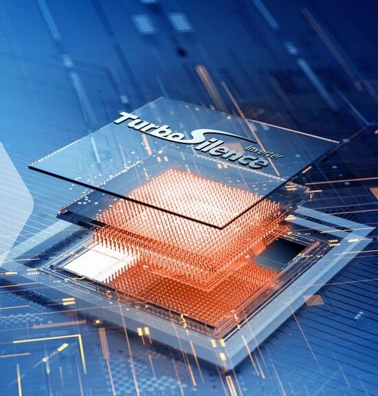Die TurboSilence Full-Inverter-Technologie ist eine optimierte Funktionstechnologie, welche auf der Full-Inverter-Technologie aufbaut. Es gleicht die Inverter-Kompressor-Regelung und Wärmetauscher Technik perfekt aus und erreicht bessere Leistungen im Turbo- wie auch im Silence-Betrieb bei gleicher Zeit wie vergleichbare Produkte.